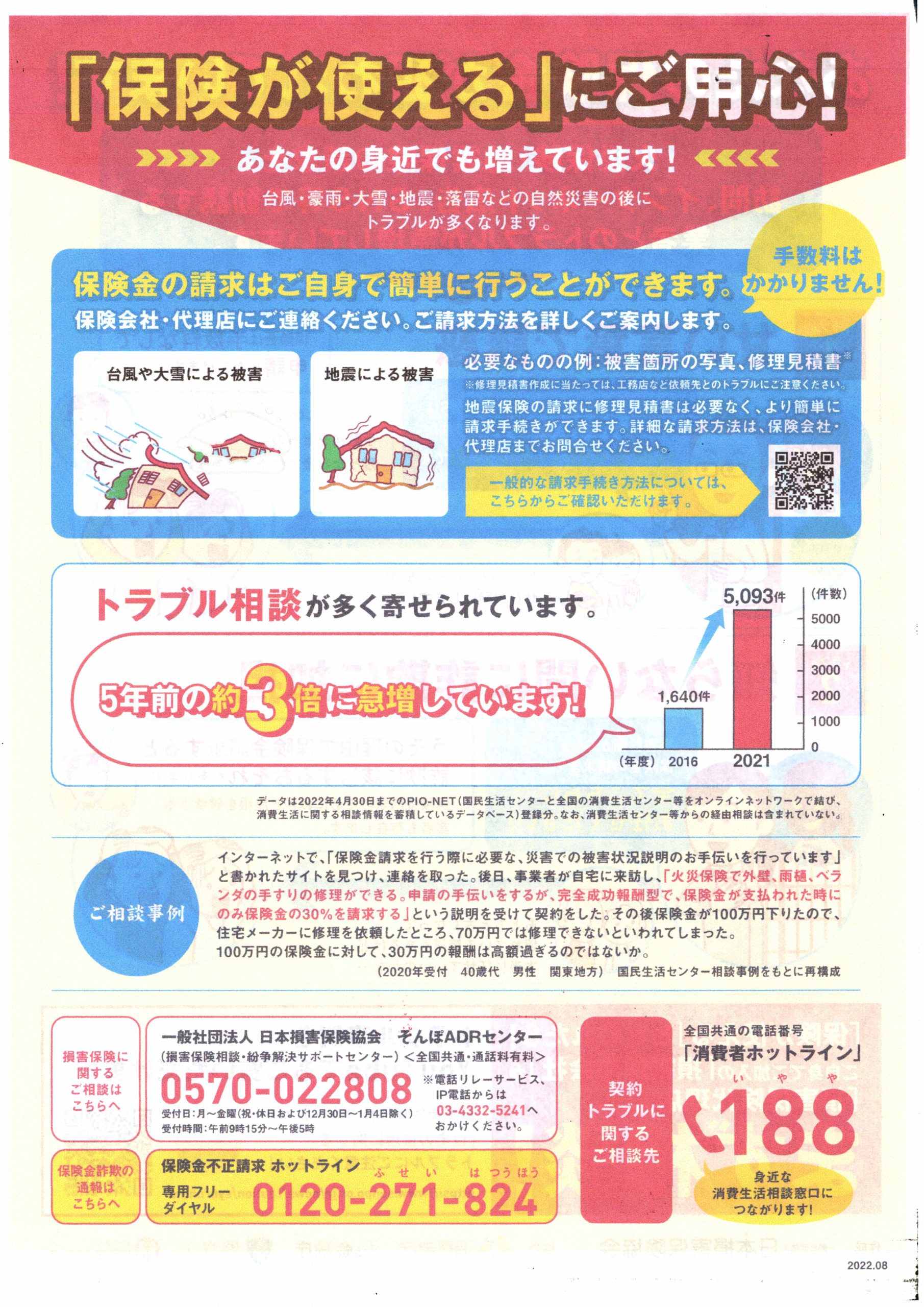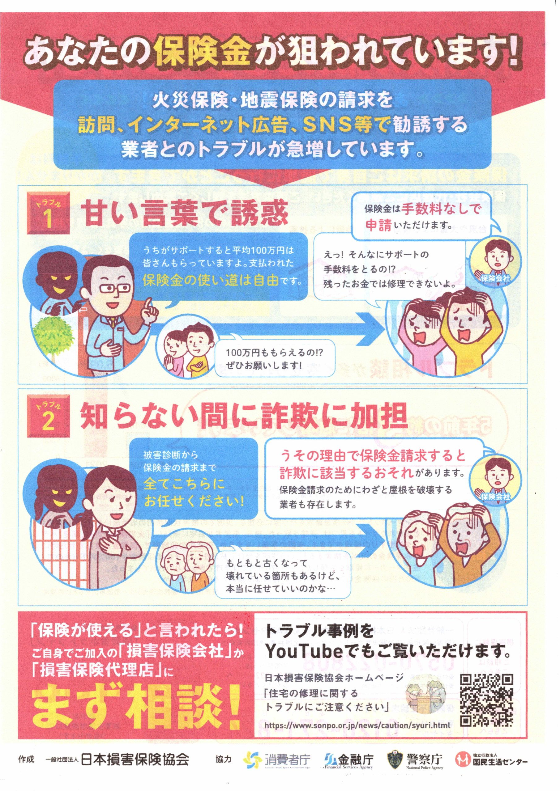 「保険を使って無料で修理します」と勧誘を受けたら注意です! 保険金請求は、ご指針で簡便に行うことができます。壊れた原因、物が保険の補償対象になるかご自身で確認しましょう。 うその理由で保険金請求をすると詐欺に該当する場合があり、トラブルに巻き込まれる可能性があります。